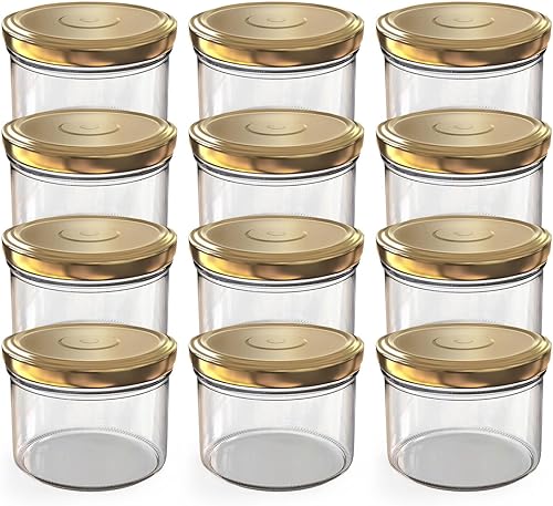 Oputec Lot de 12 bocaux de 230 ml avec couvercles à visser dorés – Parfaits pour les confitures, les confitures et plus encore, petits bocaux avec couvercle, idéal comme mini pots à confiture et