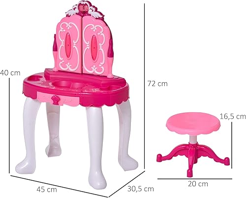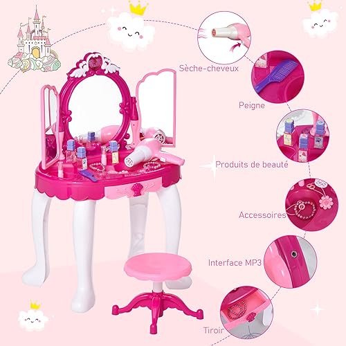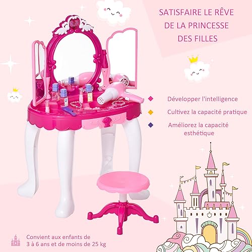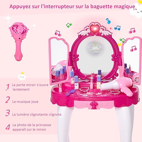 HOMCOM Coiffeuse Enfant Table de Maquillage Fonction de Lumière et de Musique Fuchsia Rose Blanc