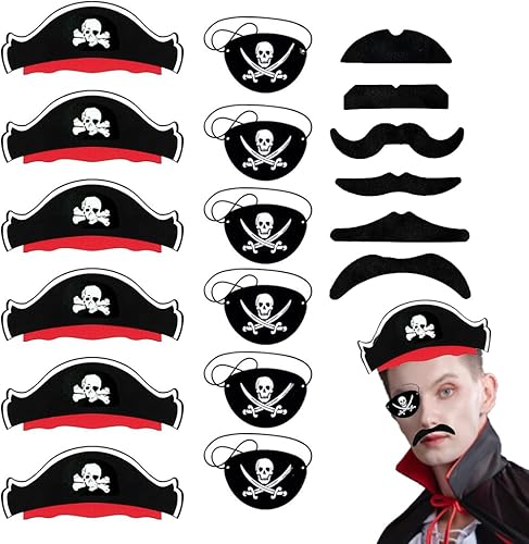 VONJUMA 6 Pcs Chapeau Pirate Et 6 Cache Yeux Set De Fausses Moustaches Chapeaux De Pirate Pour Enfants Cache Yeux Accessoires Pour Anniversaire Halloween Mascarade Fête Pirate