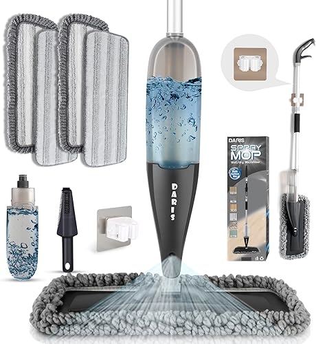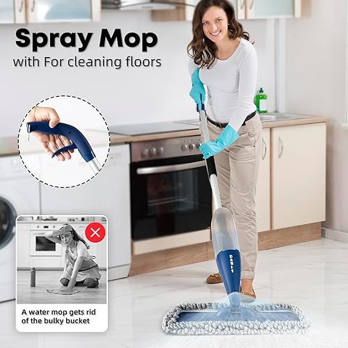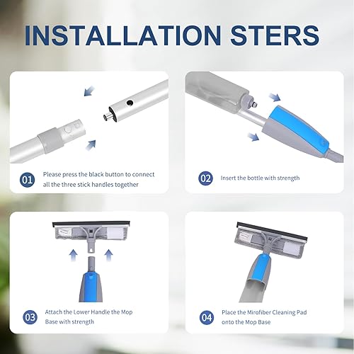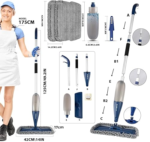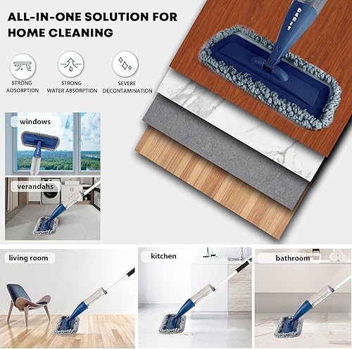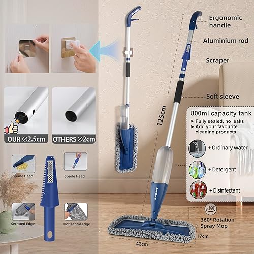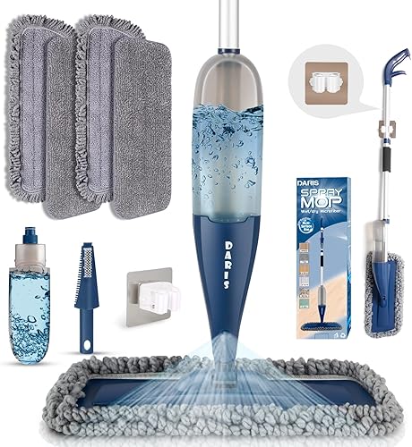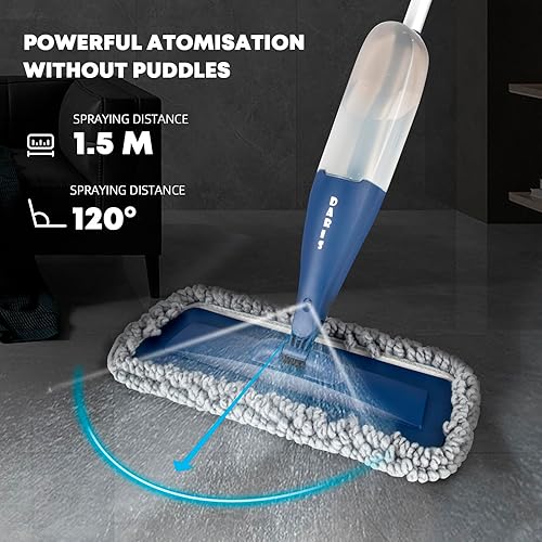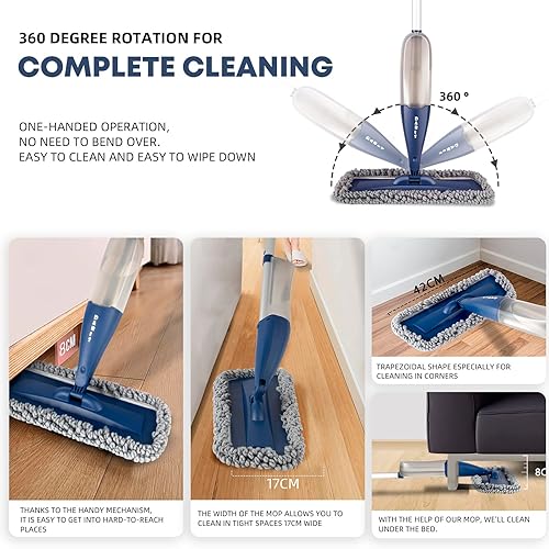 DARIS Balai à Vaporisateur pour Sol 800 ML avec 4 Lingettes Réutilisables - Nettoyage Maison Cuisine/Salon/Chambre/Salle de Bains - Raclette et Porte-Balai Inclus - Bleu