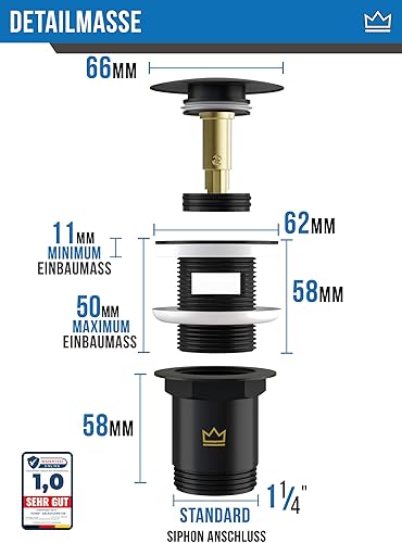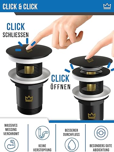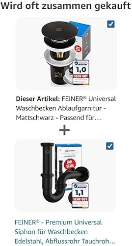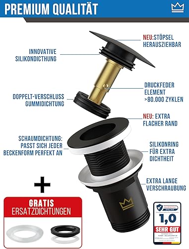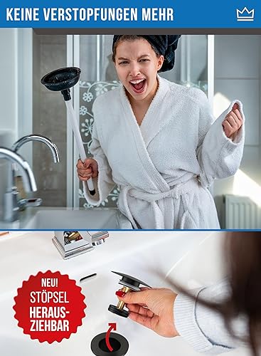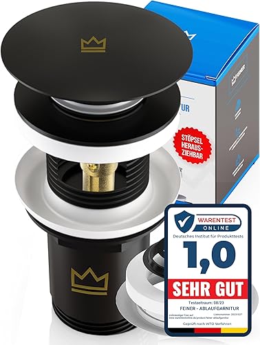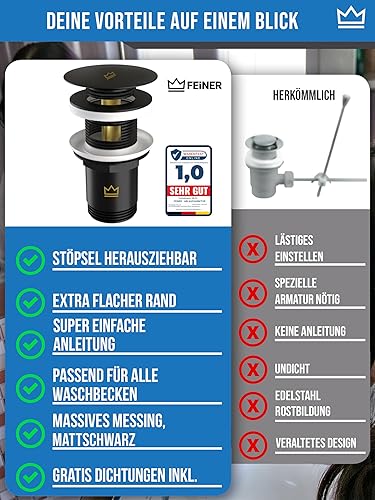 FEINER® Bonde de lavabo universelle - Noir mat - Convient pour lavabos et lavabos avec et sans trop-plein - Bouchon amovible avec attrape-cheveux - Joints et instructions de montage inclus