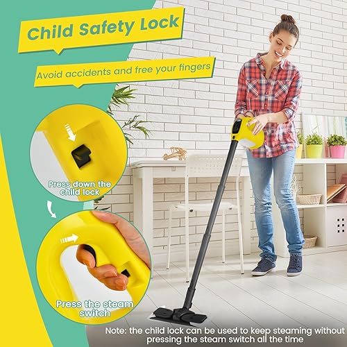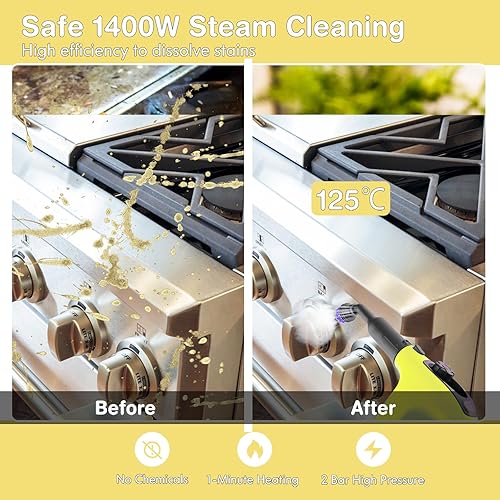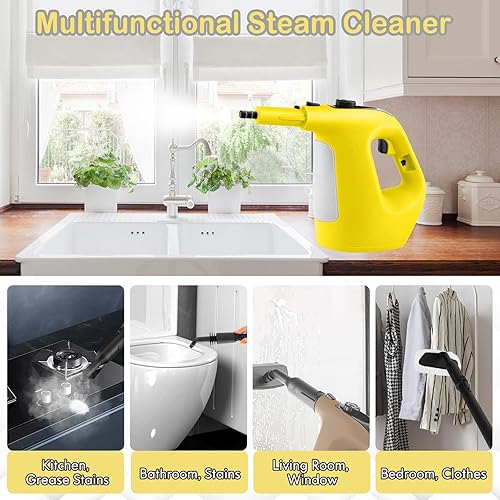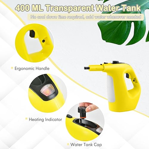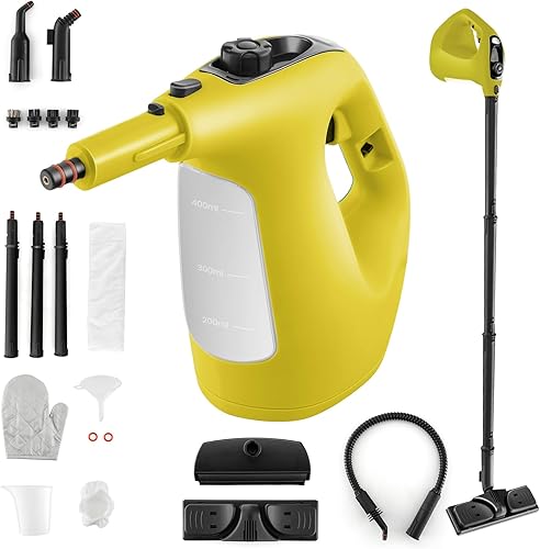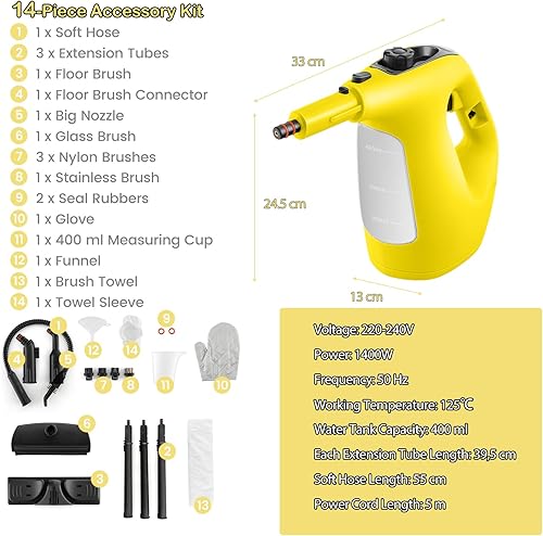 SOARS Nettoyeur Vapeur à Main 1400W, Pression Vapeur : 2 Bar, Max. 125℃, Réservoir d'Eau : 400 ML, Verrouillage de Sécurité Enfants, avec 14 Accessoires, pour Canapé, Sol, Vêtements, Cuisine (Jaune)