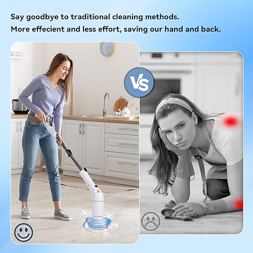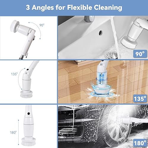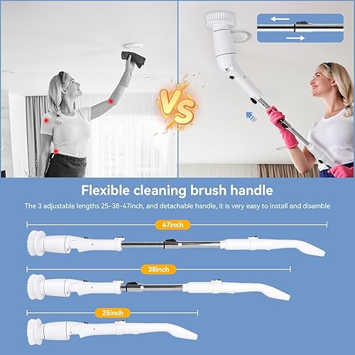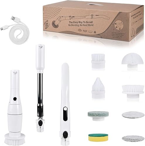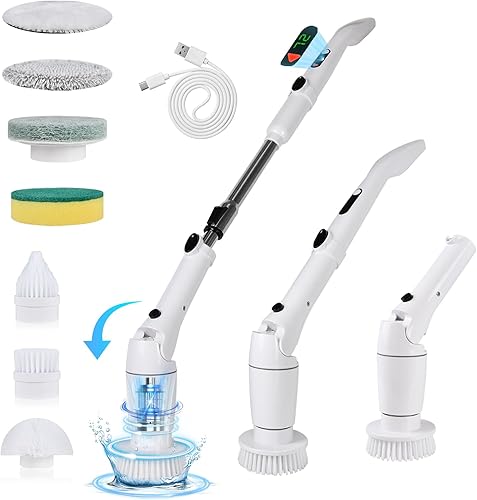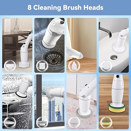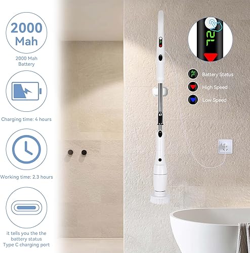 Brosse Nettoyage Electrique Rotative sans Fil, Spin Scrubber 2 Modes, 8 Brosse interchangeables, Réglable Longueur 64-119cm, Batterie 2000mAh, Indicateur LED, pour Salle de Bain Carrelage Cuisine