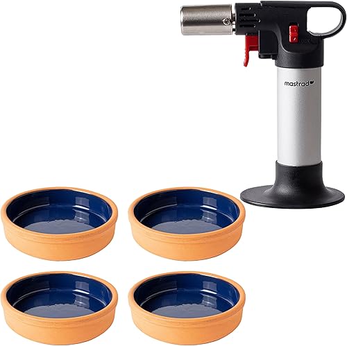 Mastrad - Coffret Crèmes Brûlées - 1 Chalumeau De Cuisine & 4 Ramequins - Caraméliser Vos Crèmes Brûlées Maison - Chalumeau Expert - Résultat Professionnel - Ramequins En Terre Cuite