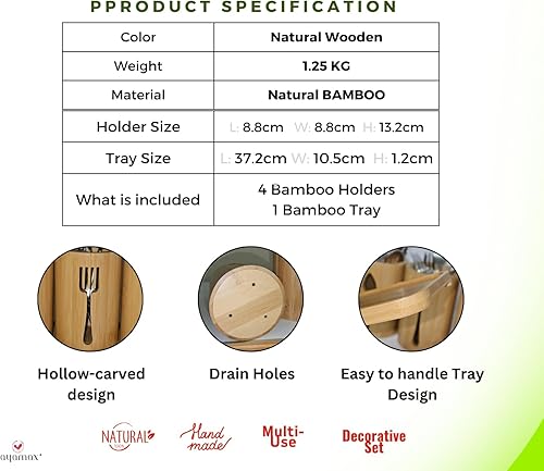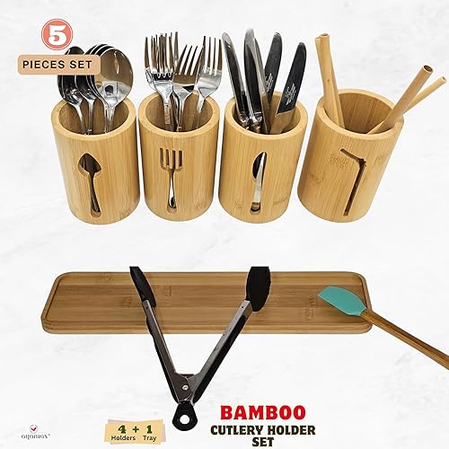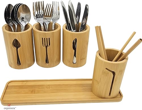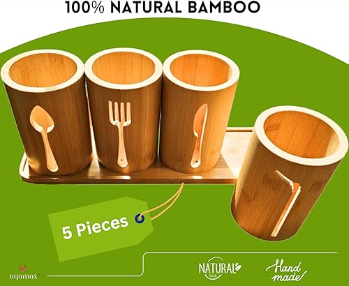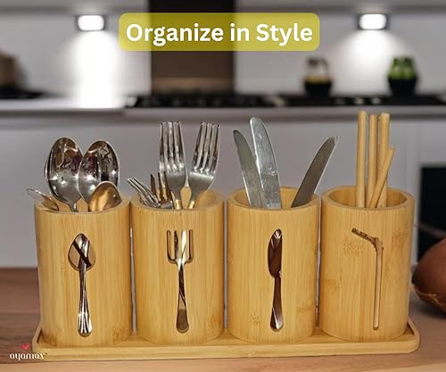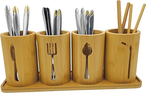 AYAMAX Lot de 4 porte-couverts en bambou avec plateau en bambou | Support décoratif pour couverts de cuisine | Organiseur d'ustensiles de cuisine