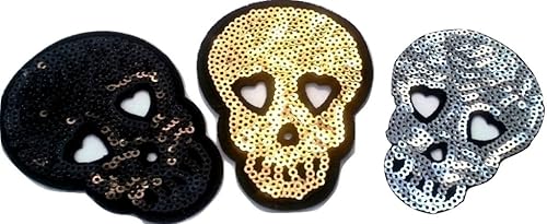 Écusson Patch Badge Brodé Crane Tete de Mort Mexicain ecusson Broderie Paillette thermocollant Trois Cranes Noir, Argent et dor 8 x 5 cm a Piece