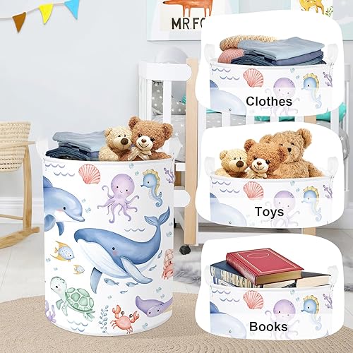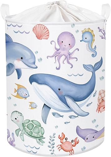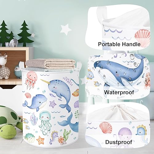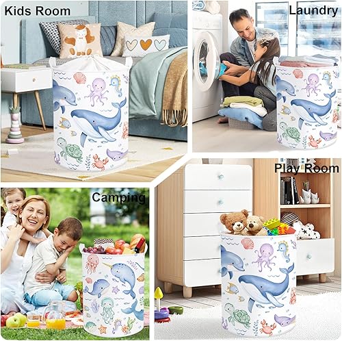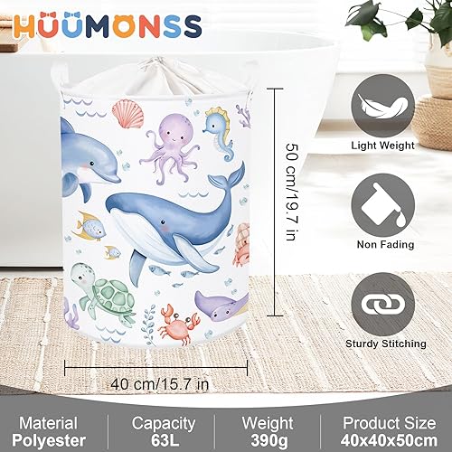 HUUMONSS Grand Paniers à Linge Animaux Marins pour Garçon Fille Repliable Panier Rangement Jouets Vêtements pour Salle de Bain Chambre à Coucher, Baleines Bleues, 63L