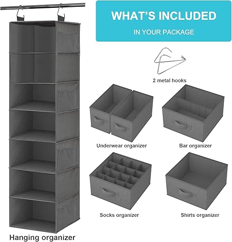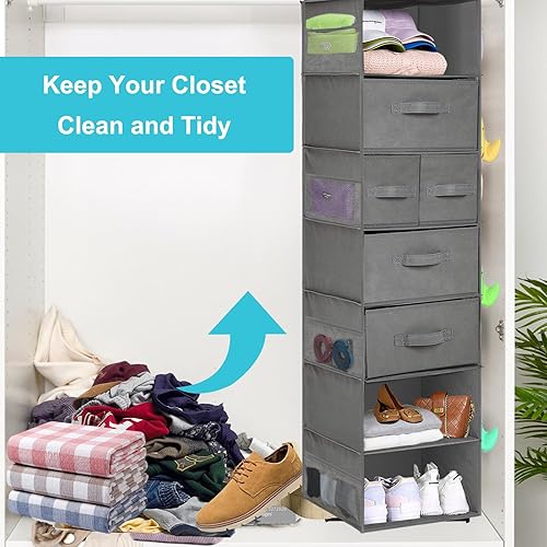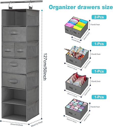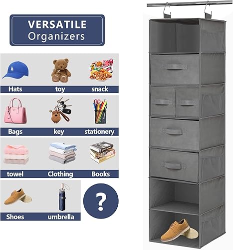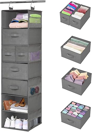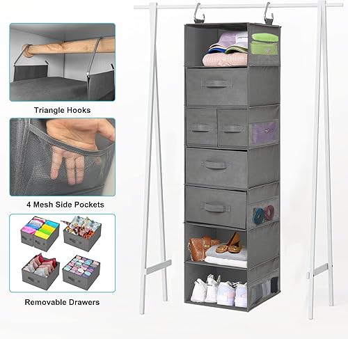 VERONLY Étagère suspendue à 7 compartiments - Organiseur de penderie - En tissu - Avec 5 tiroirs et 8 poches en filet - Système de rangement pliable pour chambre à coucher, caravane, camping - Gris