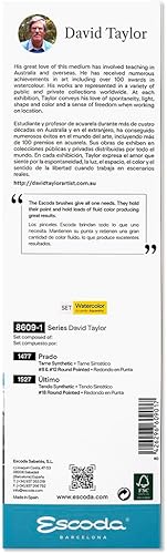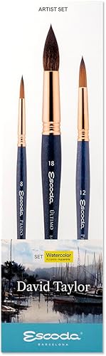 ESCODA Set 3 Pinceaux Aquarelle - N.8,12,18 Rond Pointu Fibre Synthétique Set David Taylor Série Prado Ultimo Brosses Professionnelles Fait à la Main à Barcelone.