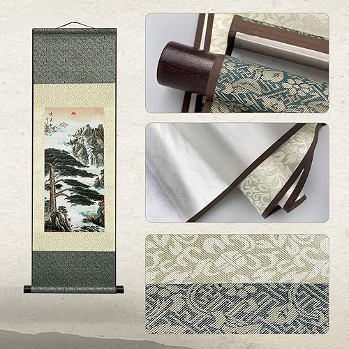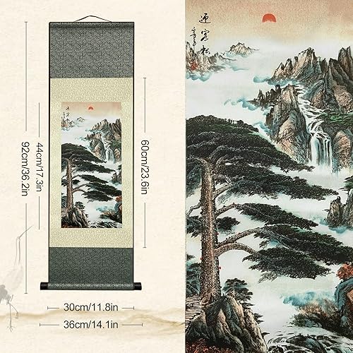 Peinture sur Rouleau Soie Asiatique Décoration Murale Peinture Paysage de Rivière Cascade - Pin Accueillant Les Invités Défilement Peinture Chinoise à Suspendre Décoration Orientale (94 x 30cm)