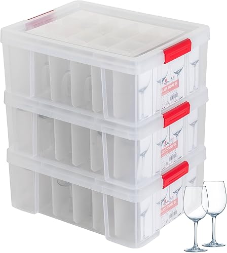 SUNDIS Glass Store, lot de 3 boîtes de rangement pour verres, en plastique transparent, renforcées avec couvercle clipsable, superposables et combinables, capacité 24 verres