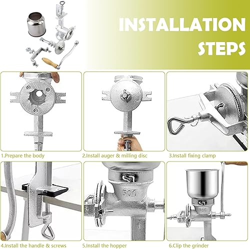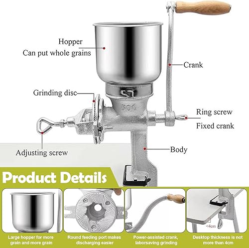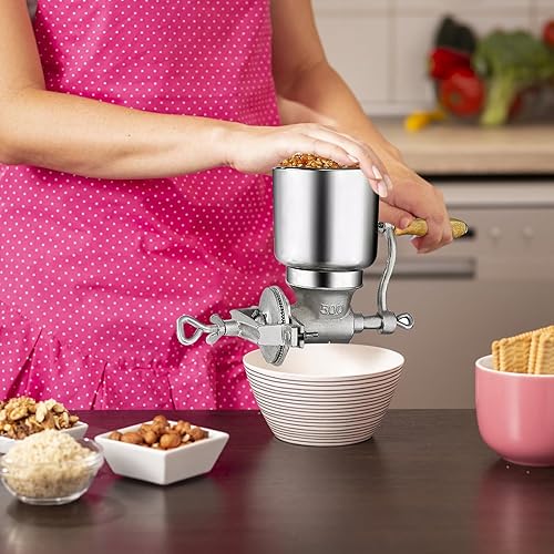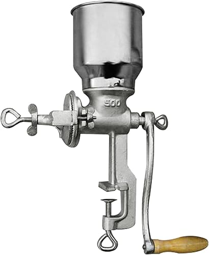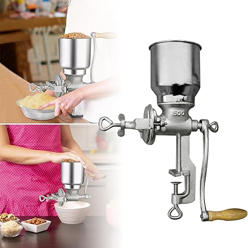 Moulin à Céréales Manuel avec Grande Trémie de 13cm & Pince de Table 4cm,Finesse de Broyage Réglable,Multifonction Broyeur à Grains en Fonte,pour Noix,Café, Céréales,Graines,Maïs,Épices