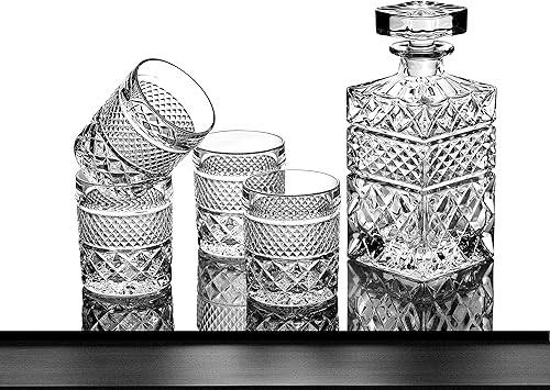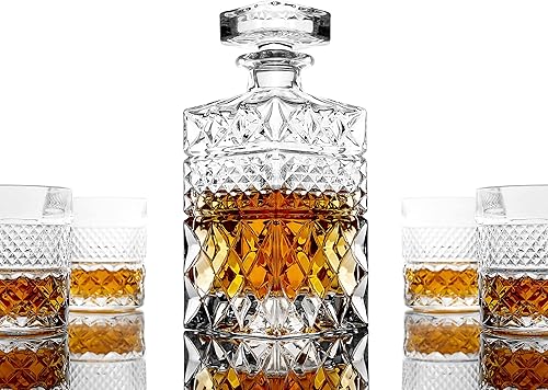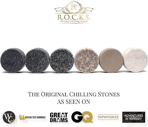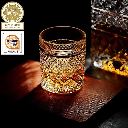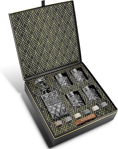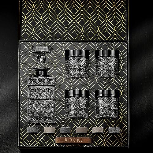 Coffret Cadeau Carafe à Whisky avec 4 Verres de Dégustation et 6 Pierres à Whiskey Artisanales en Granit - Somptueux Decanteur pour Cognac, Bourbon, Rhum - Magnifique Coffret Or à Chaud