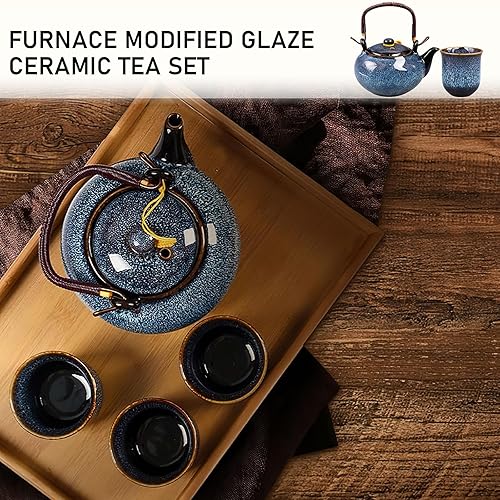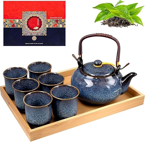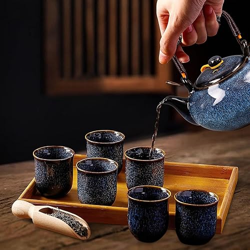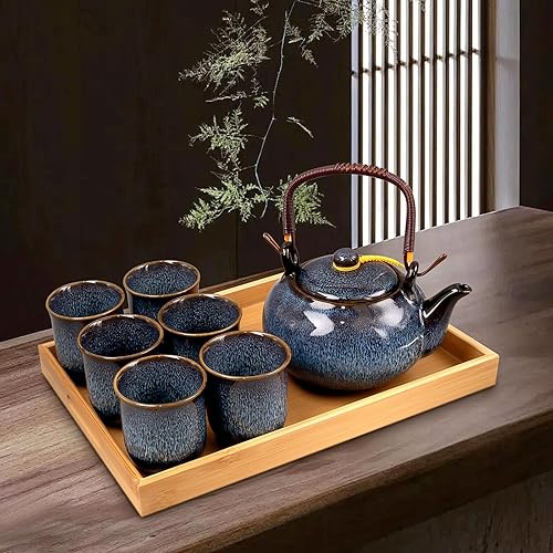 Théière japonaise en céramique de 650 ml avec 6 tasses à thé et plateau en bambou, théière émaillée modifiée au four pour adultes, amateurs de thé, homme et femme, bleu marine