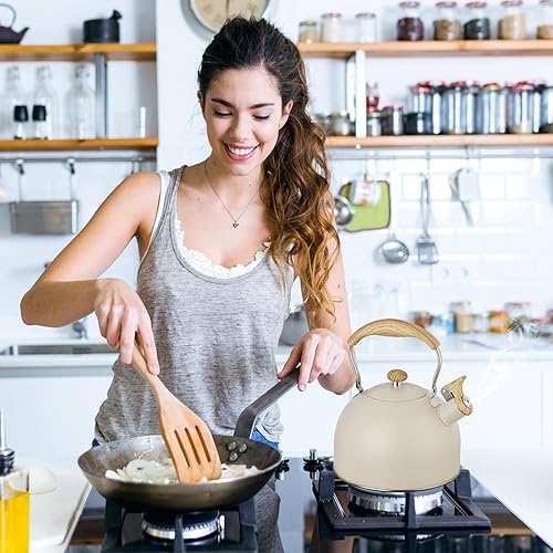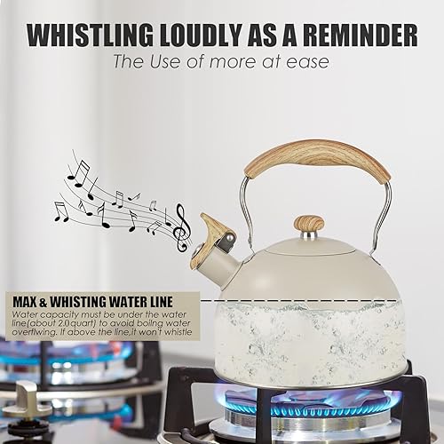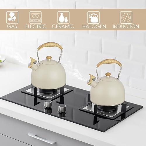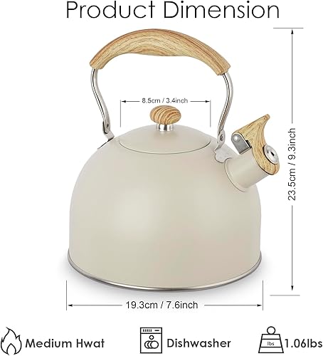 Bouilloire sifflante en acier inoxydable de 2,5 L avec poignée en grain de bois, théière pour plaques à gaz, induction, cuisinière et plaques électriques (beige)