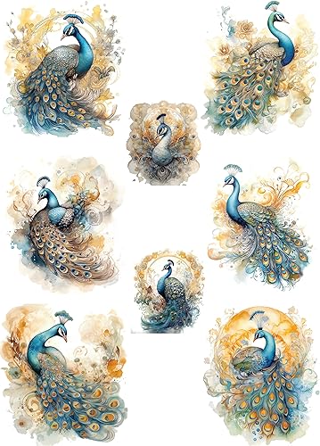 Papier de riz paon, 29,21 x 40,64 cm – 8 images uniques de paon imprimées sur du papier de mûrier 36 g/m², fibres visibles pour découpage, meubles, rénovation, travaux manuels.