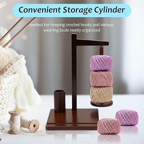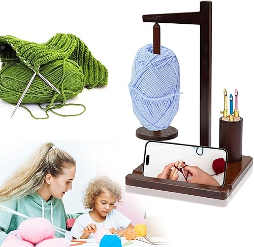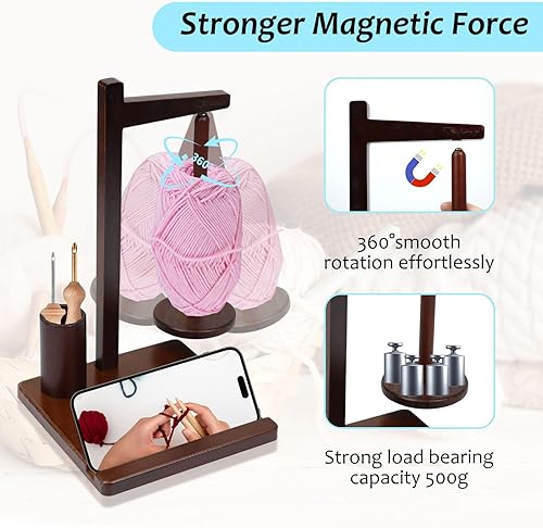 Qivine Dérouleur De Laine, Magnétique Porte Fil en Bois pour Tricot, Support Pelote de Laine, Rotatif de 360° Combiné avec Support de Téléphone Portable pour Crocheter et Tricoter