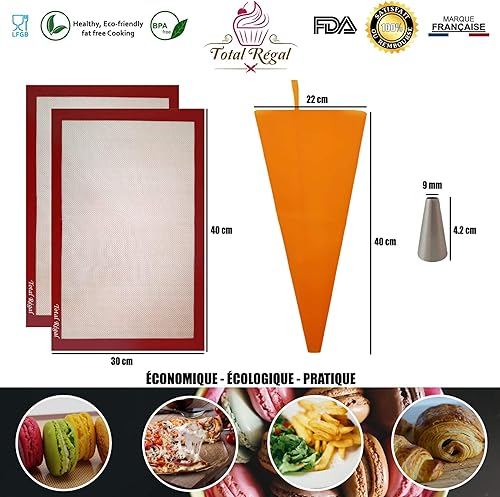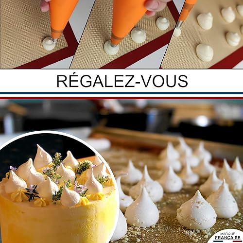 kit pâtisserie professionnel, 2 tapis de cuisson en silicone 40X30 lavable anti adhérent certifié sans BPA,1 poche réutilisable, douille Macaron, biscuit, pizza. Toile, feuille, plaque pour four