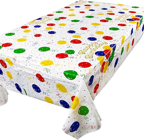 BETESSIN 2Pcs Nappe Fête Anniversaire Imperméable 137x274cm Plastique Couverture Rectangulaire avec Ballon Coloré Nappe Party Happy Birthday Linge de Table à Manger Cuisine Banquet Anniversaire