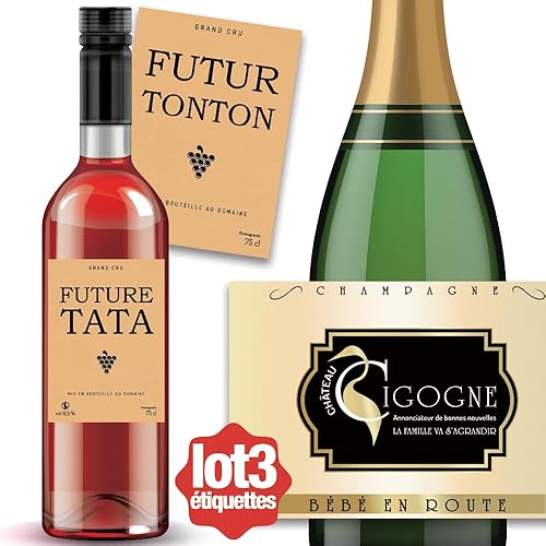 Lot de 3 étiquettes pour bouteilles pour annonce de grossesse originale : étiquette vin futur tonton + future tata + étiquette champagne bébé en route