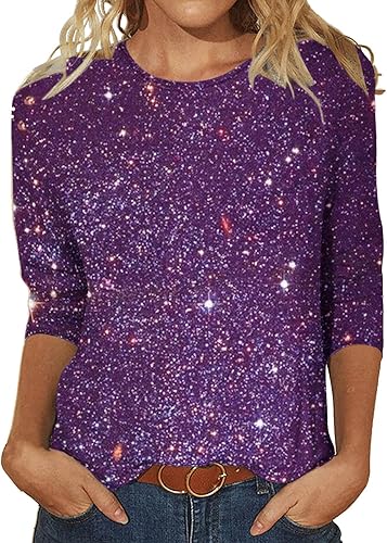 T-shirt à paillettes pour femme - Trois manches - Col rond - Tendance - Haut long pour femme, violet, M
