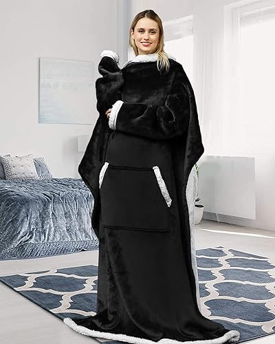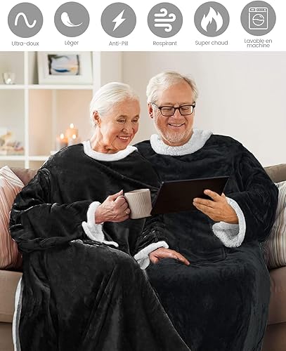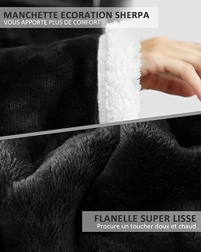Maxesla Couverture Portable avec Manches et Poches, Pull Plaid Femme Flanelle Microfibre, Douce et Chaude Plaid Pull Femme, 175 x 130 cm, Noël Idée Cadeau pour Homme et Femme, Noir