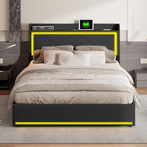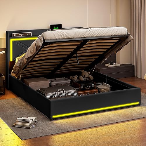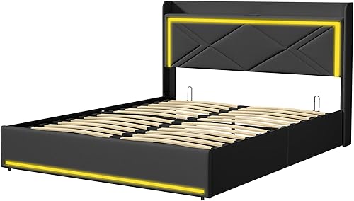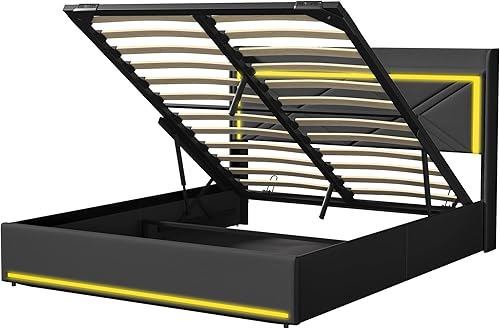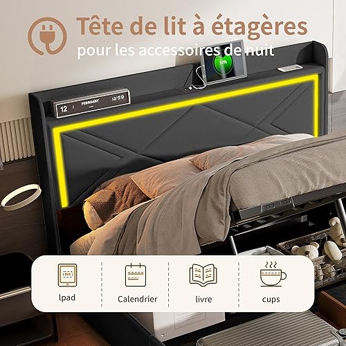 Lit Coffre LED 160x200 cm avec Rangement, Lit Double avec Espace de Rangement et hydraulique, Tissu en PU, Blanc (sans Matelas)