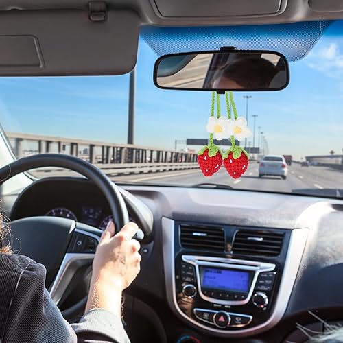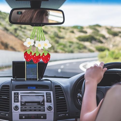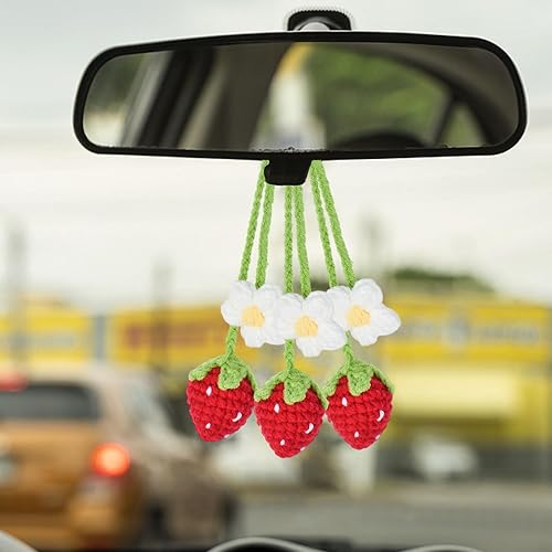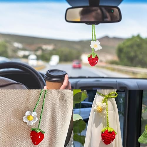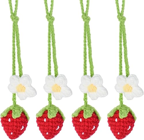 Lot De 4 Pendentifs pour Rétroviseur De Voiture, Fraise Tricotée à La Main, Décoration à Suspendre pour Rétroviseur De Voiture, Accessoire De Sac, Sangles De Rideau