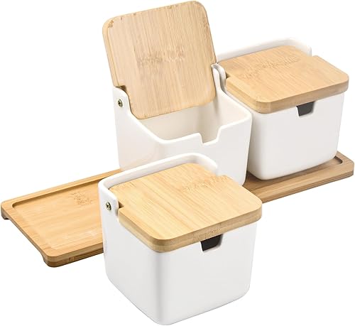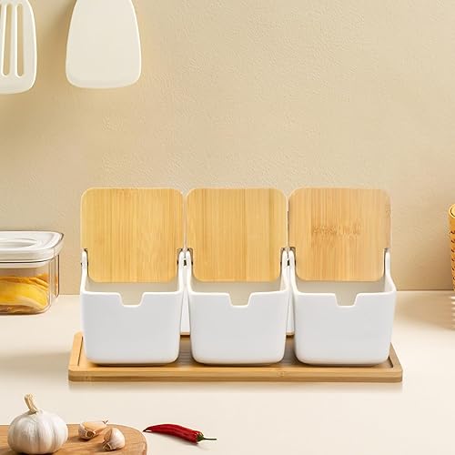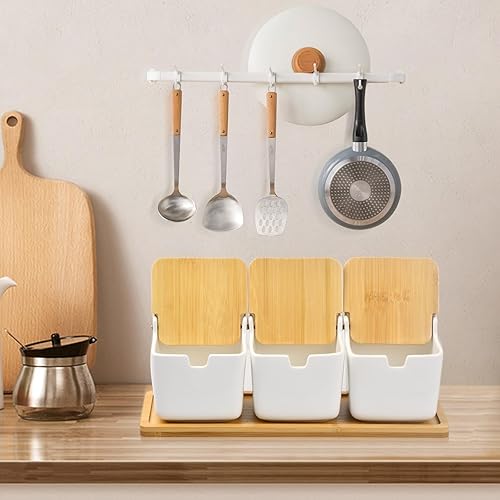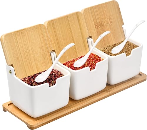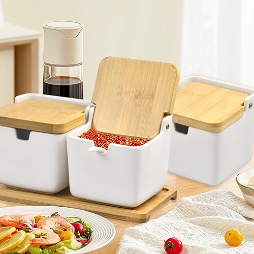Volumoon Lot de 7 boîtes à épices avec cuillère et Couvercle, Pot à condiments en céramique avec couvercles,Contenant des Épices Condiment Pot,Pot à épices en céramique,pour Sucre Sel Spice
