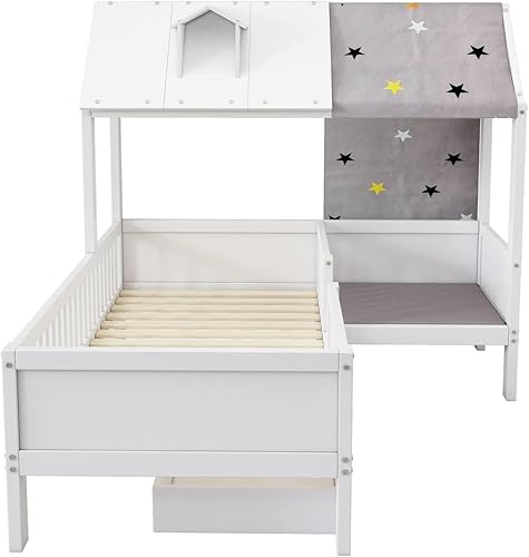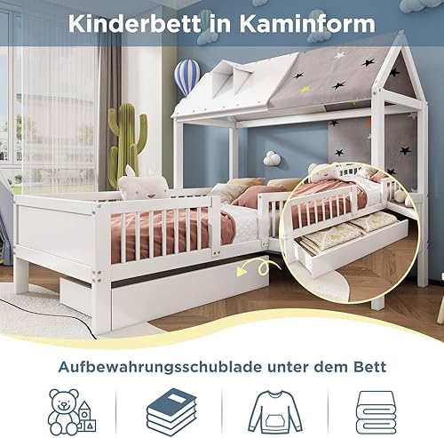 Sweiko Lit d'enfant 90 * 200cm en Bois en Forme de Maison, lit Simple Multifonctionnel, Cadre de lit avec tiroirs, sans Matelas