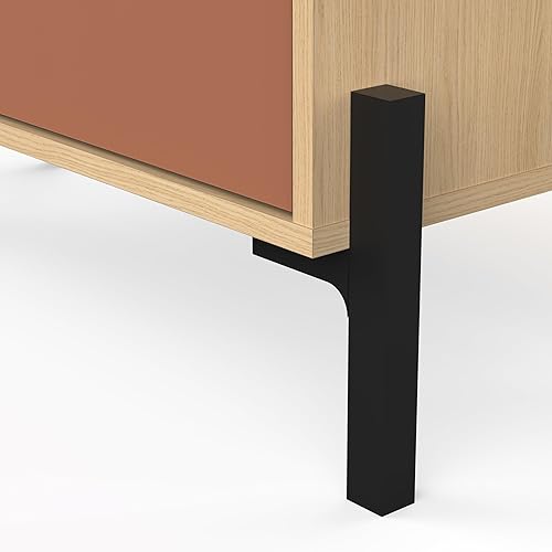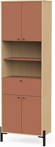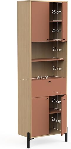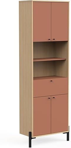 Armoire De Salle Bain avec Rangements, 4 Portes & 1 Tiroir Waterproof en Bois – Gamme Elisa Made in France – Coloris Terracotta & Chêne Vincenza - 64 x 201 x 33 cm, Abricot
