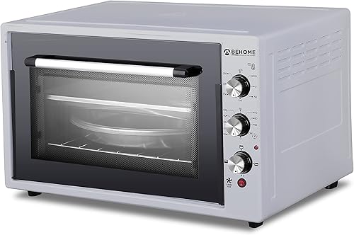 Behome Four électrique 60 litres ventilé | autonettoyant, émaillé, température jusqu'à 320° double verre avec lumière intérieure et minuterie 2 plaques et 1 grille (60 L, argent)
