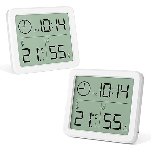 Gvolatee 2 pièces Mini Thermometre Interieur Numérique, Hygrometre Portable Professionnel Grand Écran avec Horloge, Thermomètre Blanc Précis, Hygromètrepour la Maison, Chambre Bébé, Bureau, Serre