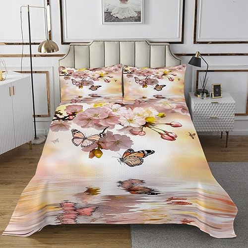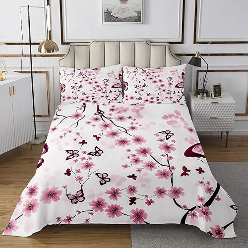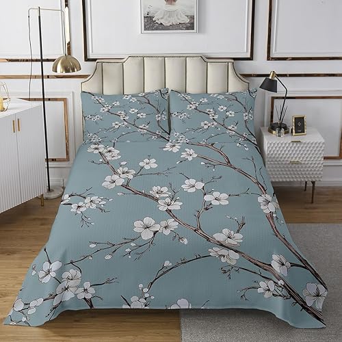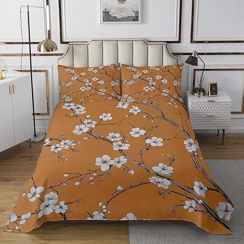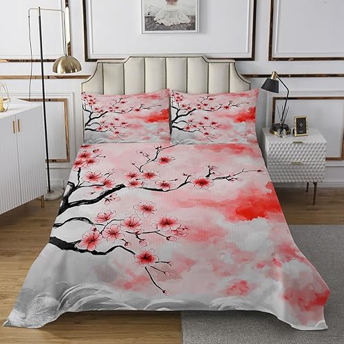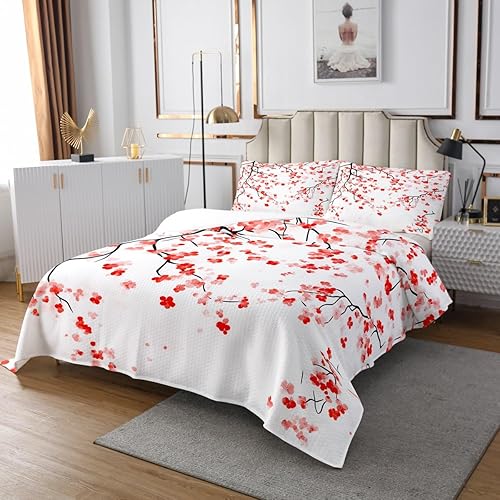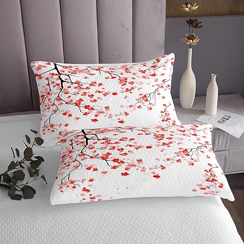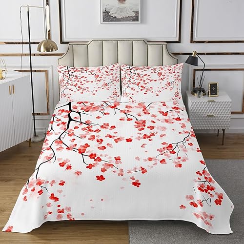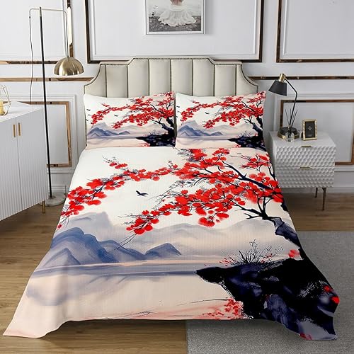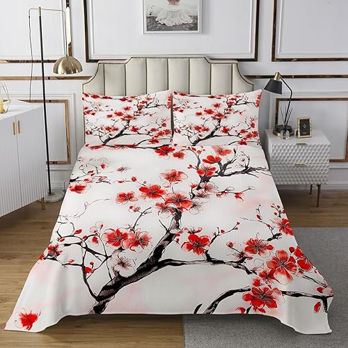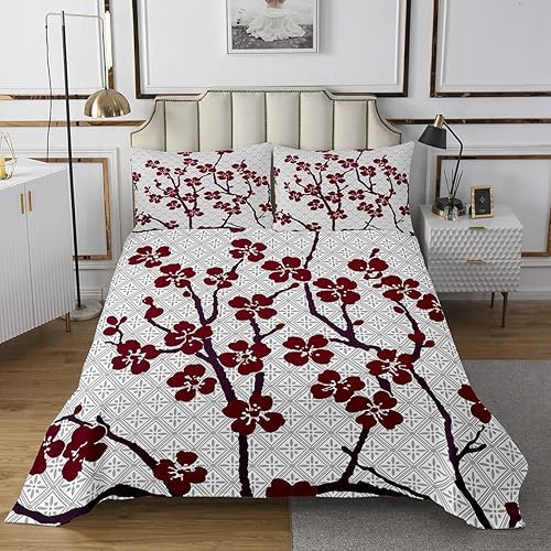 Homewish Couvre-Lit 260x240 Fleurs de Cerisier Japonais Dessus de Lit Fleurs Rouges Couverture de Lit,Fleurs Vintage Couette Plante de Montagne de Printemps avec 2 Taies d'oreiller
