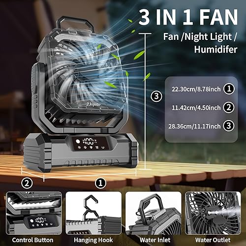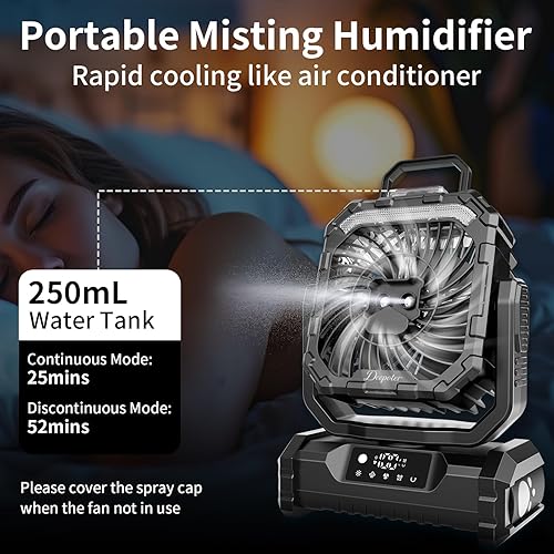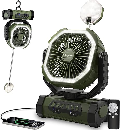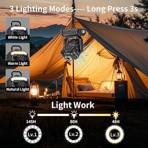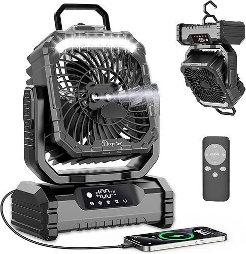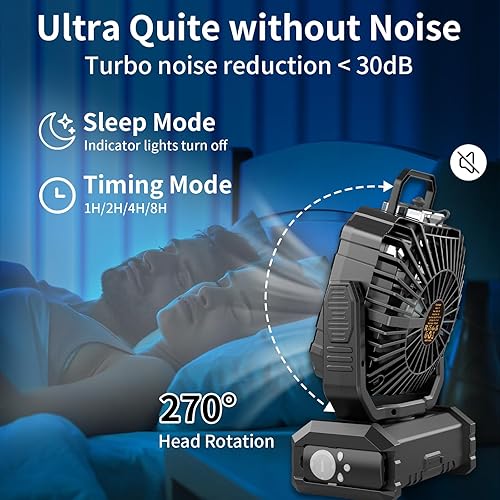 OUTACT Ventilateur de Camping 20000mAh USB Rechargeable avec Lumière LED, Ventilateur Portable à 5 Vitesses avec Télécommande, Crochet et Minuterie pour Chambre, Bureau, Tente, Plage, Vacances - Noir