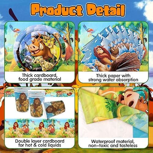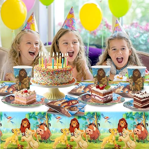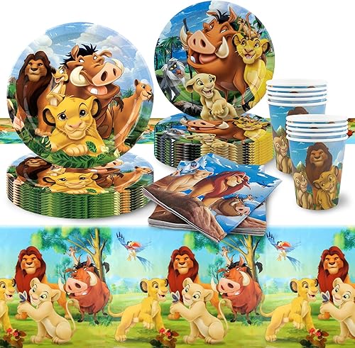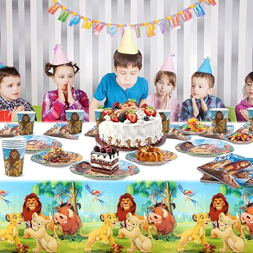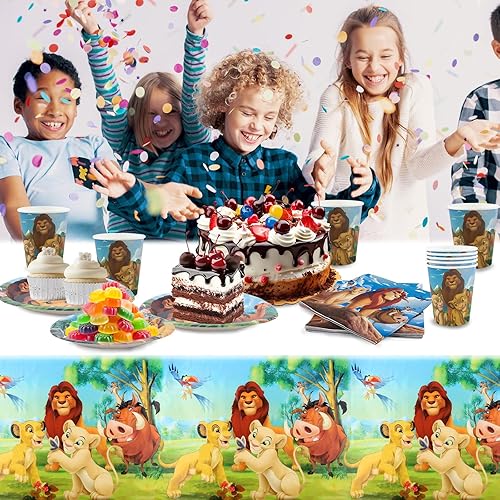 Lot de 52 décorations d'anniversaire Lion-King - Assiettes en carton - Assiettes en carton - Gobelets - Serviettes - Décoration d'anniversaire pour 10 personnes