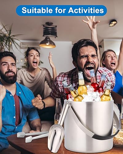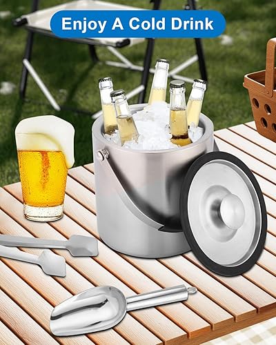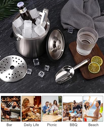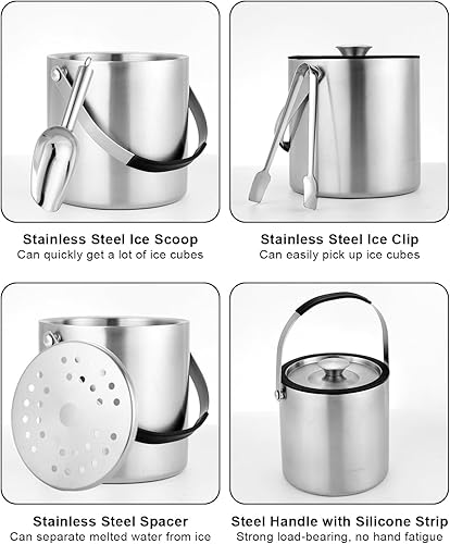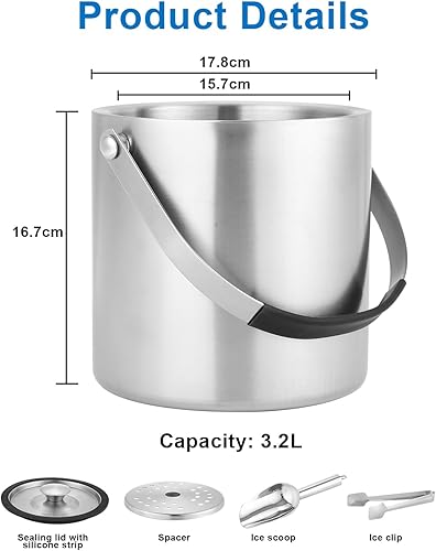 Goxiry Bac à glaçons avec couvercle 3,2 l - Seau à glace en acier inoxydable avec pelle, clips et passoire - Double paroi pour refroidir la bière, le champagne, le vin et les glaçons