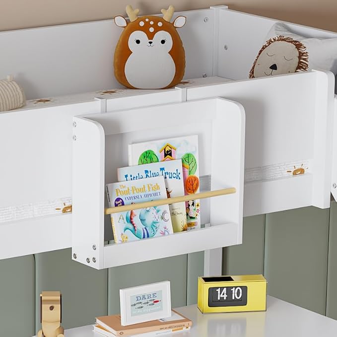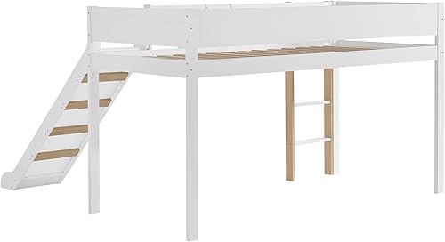 AEMOING 90 x 200 cm, lit mezzanine, superposé, avec échelle droite à trois niveaux, lit pour enfant, adolescent, avec toboggan, étagère amovible, pin + MDF, blanc + naturel