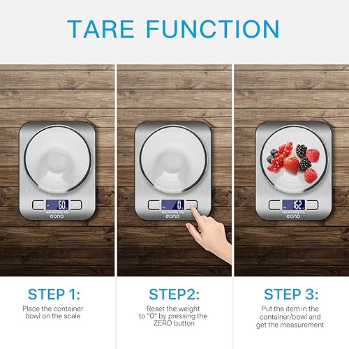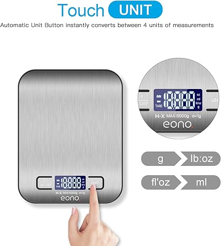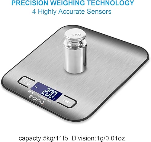 Eono by - Balance de Cuisine/pâtisserie numérique en Acier Inoxydable de Haute qualité, avec Fonction grammes et onces, Garantie de 15 Ans et Charge maximale de 5 kg par paliers de 1 g
