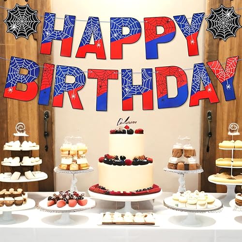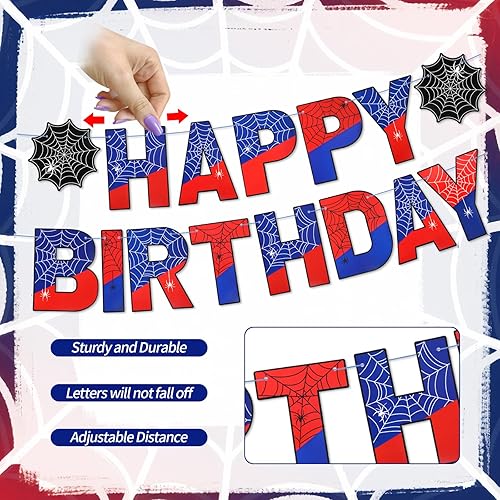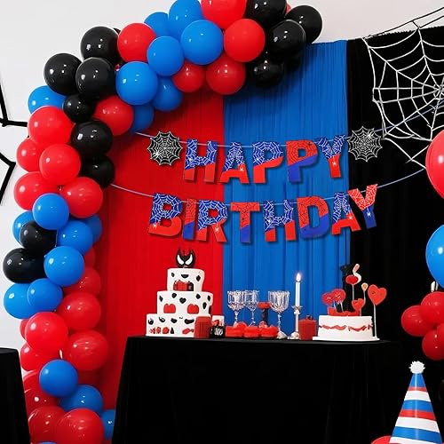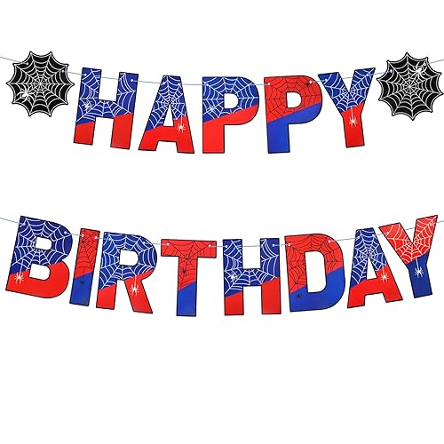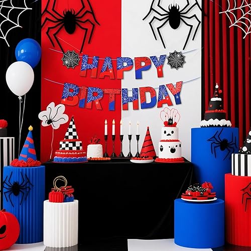 SAVITA Bannière Anniversaire sur Thème Araignée, Guirlande Joyeux Anniversaire Rouge et Bleue avec Ruban et Enfileur pour Toile de Fond de Fête Suspendue à Faire Soi-Même