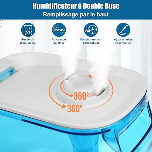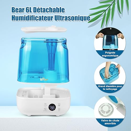 Bear Humidificateur 6L Top Fill Humidificateur, Minuterie, Mode Sommeil, Humidité constante, Aroma Disc, Double buse rotative 360°, 28db Ultra Silent, Convient aux Bébés Et aux Plantes