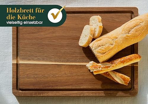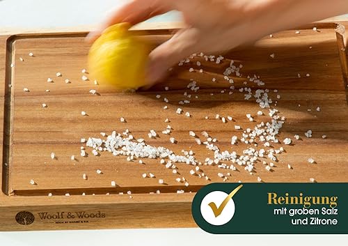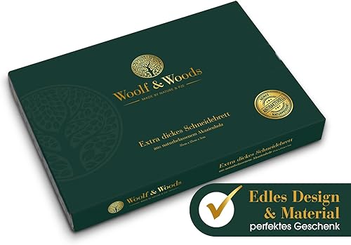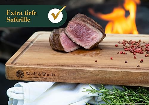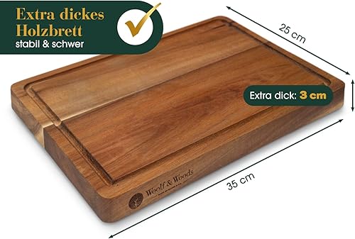 Woolf & Woods Planche à découper en bois extra épaisse - Produit naturel pur en acacia - Durable - Non traité - Planche de cuisine et plateau de service - 35 cm x 25 cm x 3 cm