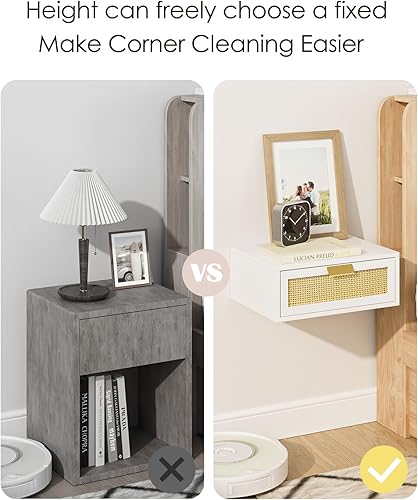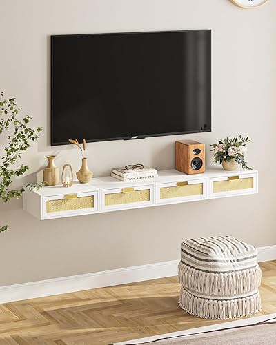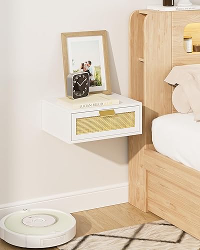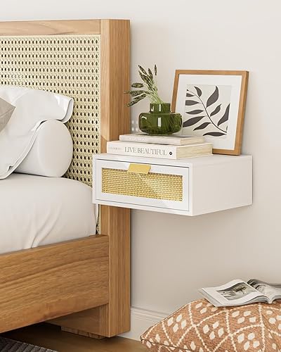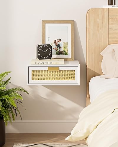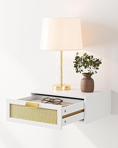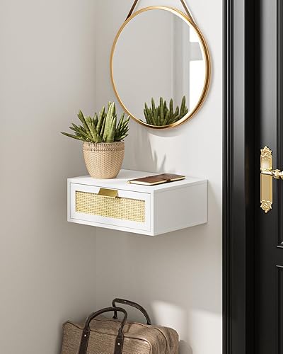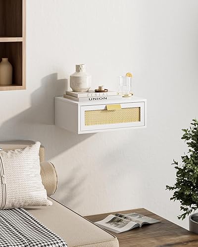 HEYZOEY Table de chevet flottante en rotin avec tiroir - Étagère flottante pour salon, salle de bain, chambre à coucher - Blanc