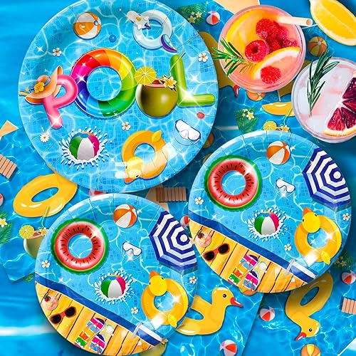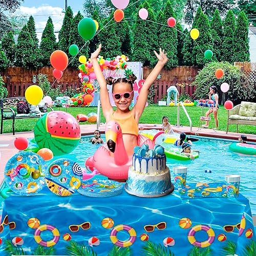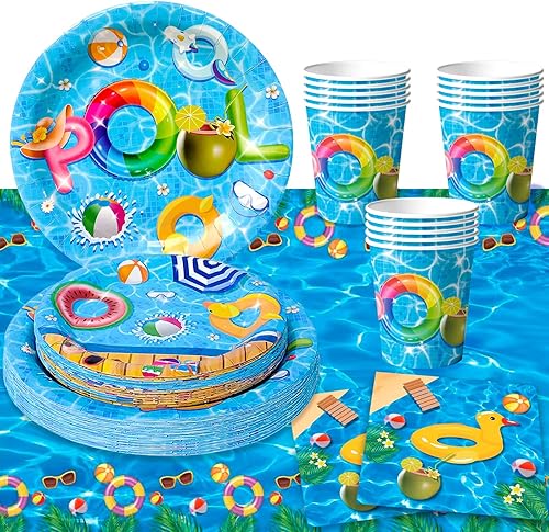 Fournitures Fête D'été à la Piscine,97pcs Ensemble de Vaisselle D'anniversaire de Piscine-Assiettes et de Serviettes de Fête Gobelets et Nappe pour la Décoration de Piscine D'été