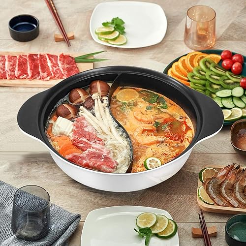 Faitout avec séparateur pour cuisinière à induction, batterie de cuisine double face pour soupe chinoise shabu shabu shabu pour maison, fête, réunion de famille, 4,5 l (blanc)