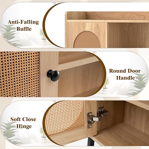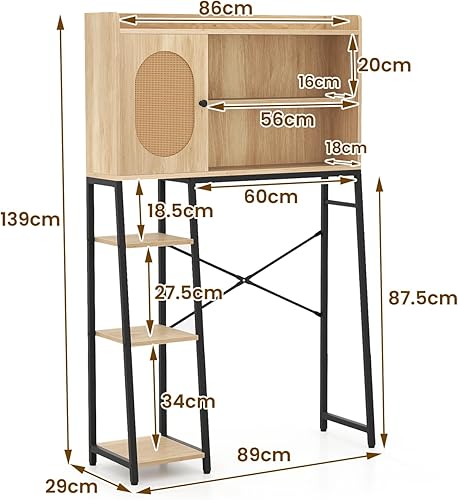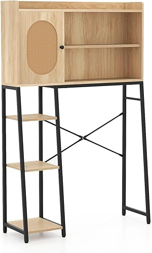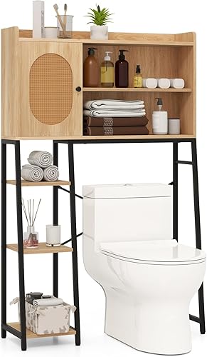 LIFEZEAL Meuble Dessus WC, Meuble Toilettes Salle de Bain Rangement, avec Portes en Rotin et Étagère, Rangement au-Dessus des Toilettes avec Cadre Métallique, 89 x 29 x139 cm, Naturel