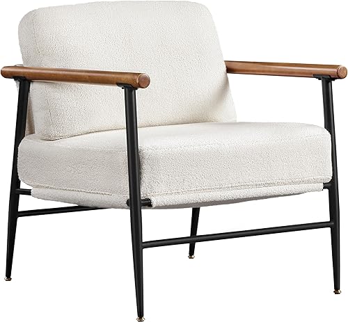 Yaheetech Fauteuil de Relaxation en Tissu Bouclette Rembourré Fauteuil de Salon Design Moderne Élégant Cadre Métallique Accoudoirs Bois Fauteuil d'appoint pour Chambre Salle de Réception Blanc Blanc/1