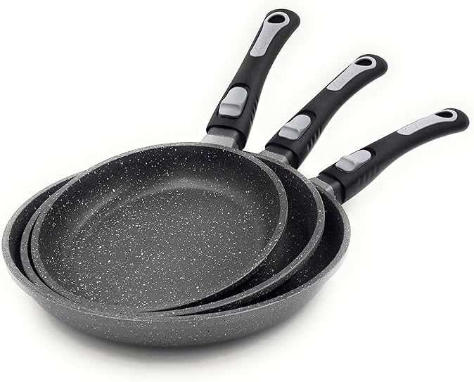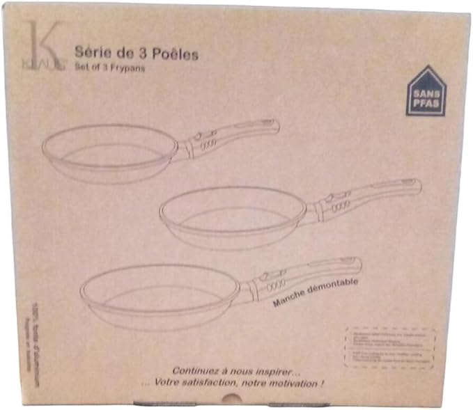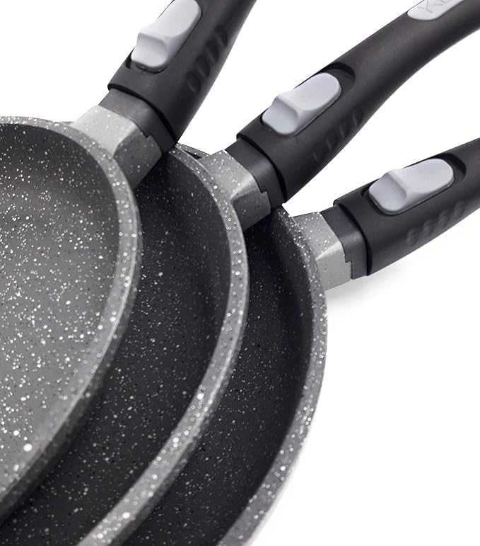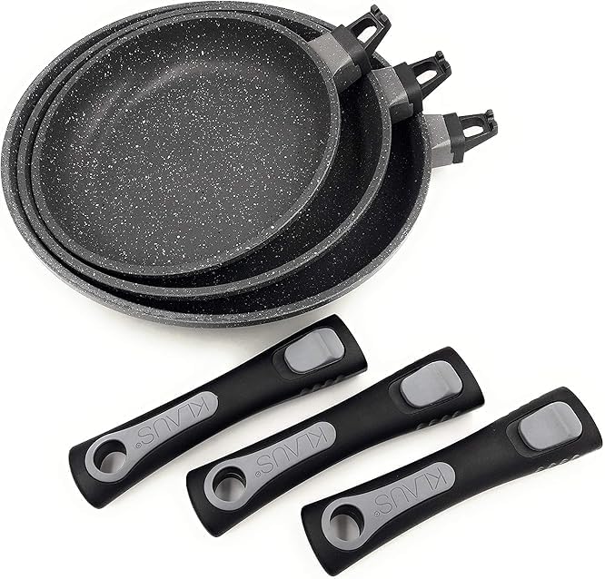 KLAUS Lot de 3 poêles en Pierre de Hautes qualités antiadhésif Compatible Tous Feux Dont Induction les 3 poêle à frire adapté au Four grâce à Leur Manches Amovibles Ø 20 cm, Ø 24 cm et Ø 28 cm