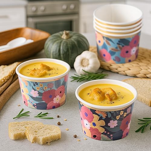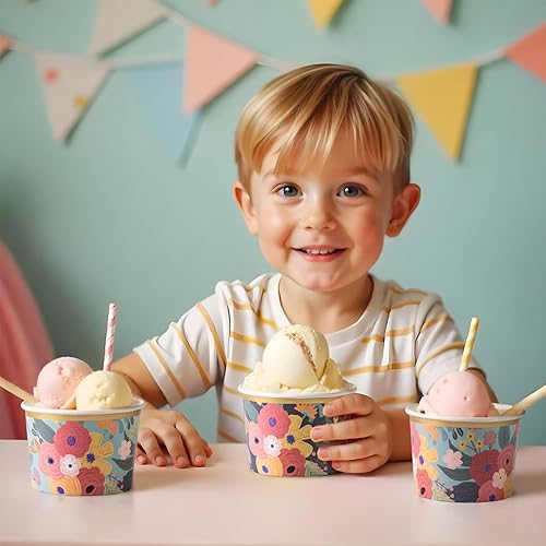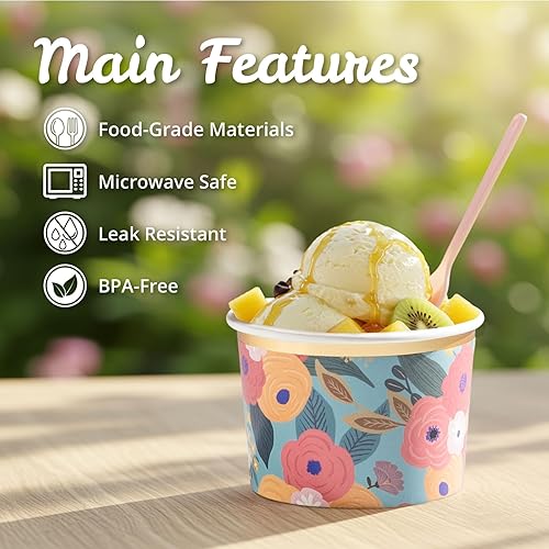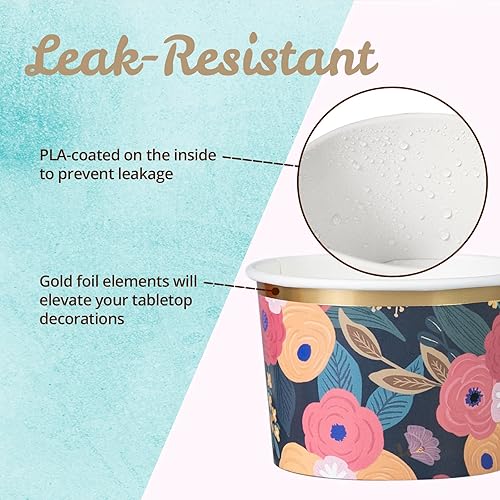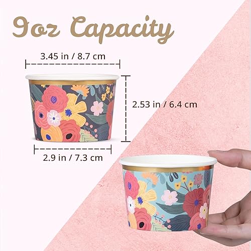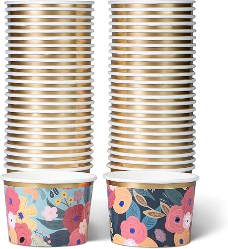 Lot de 50 Pots Glace 266 ml et Coupelles Jetables – Bols en Papier avec Motif Floral et Bord Doré – Pot à Glace Jetable, Coupelle Jetable Chaud/Froid pour Fêtes, Mariages, Desserts et Soupes