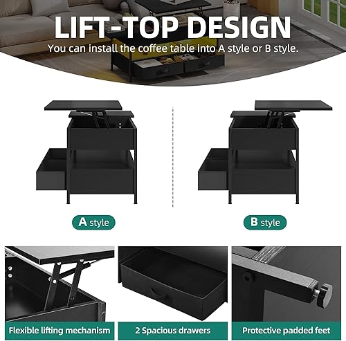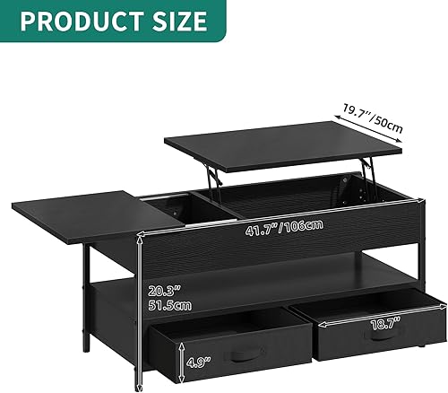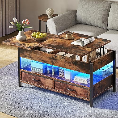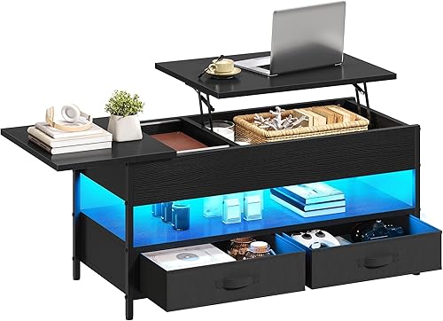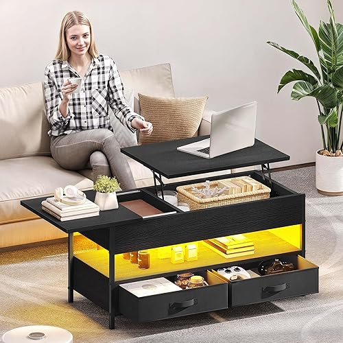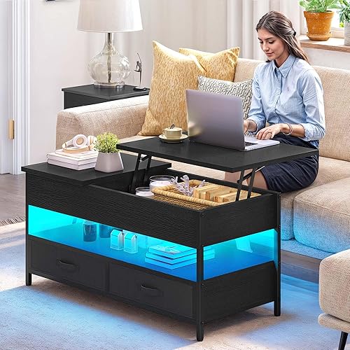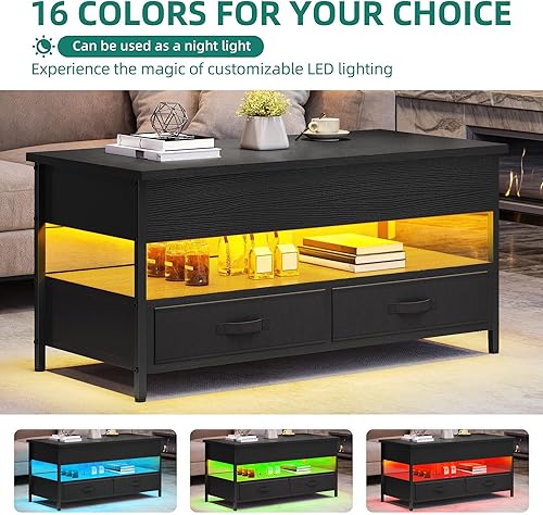 YITAHOME Table Basse Relevable, Table Basse Salon Noir avec Ruban LED RGB et 2 Tiroirs, 106 x50x51,5cm, Table Basse avec Plateau élévateur et Rangement Caché, Idéal pour Le Salon